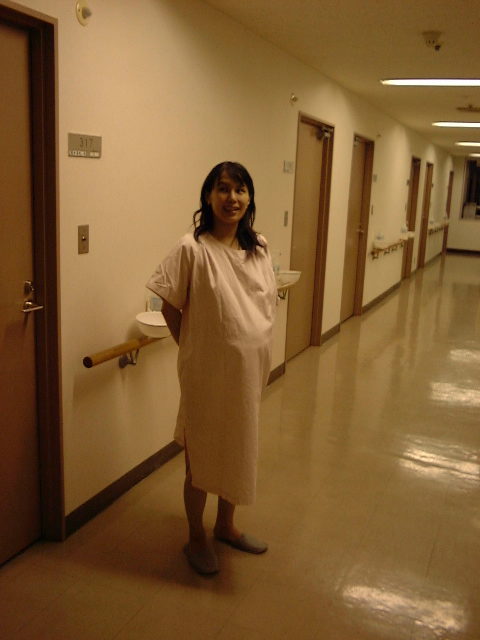 看護婦さんがときどき来て、お腹の音を聞きにくる。赤ちゃんはまだかなり上の方にいるので、寝ているよりも歩いたり、座ったりして、重力の力を借りて下に行くようにした方がいいとのことで、病院内を散歩する。