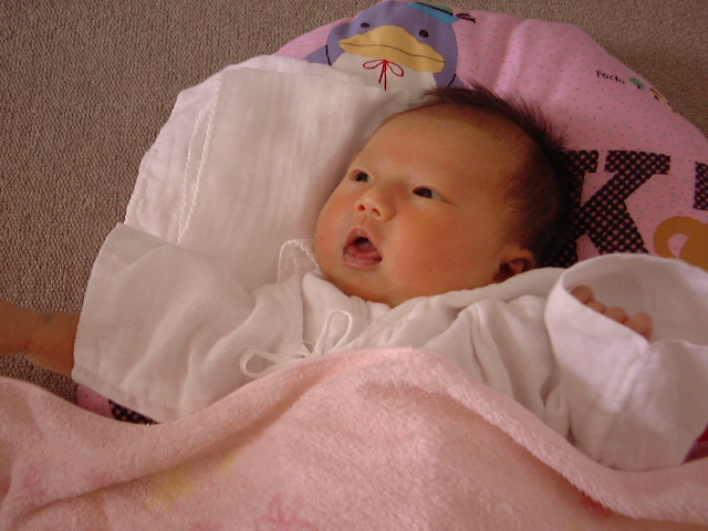 日南子はここ2、3日、授乳後に鼻がぐずぐずつまっている。風邪ではないようだが心配なので 育児書で調べると3、4週の赤ちゃんによくあることで1か月過ぎると自然に治るとのこと。 外気にあてるとよくなるようだ。確かに日南子は、むずかってる時に風通しのよい台所の窓の側に行ってあやすとすぐ泣き止む。そろそろちょっとずつ表に出て気道をきたえたほうがいいようである。