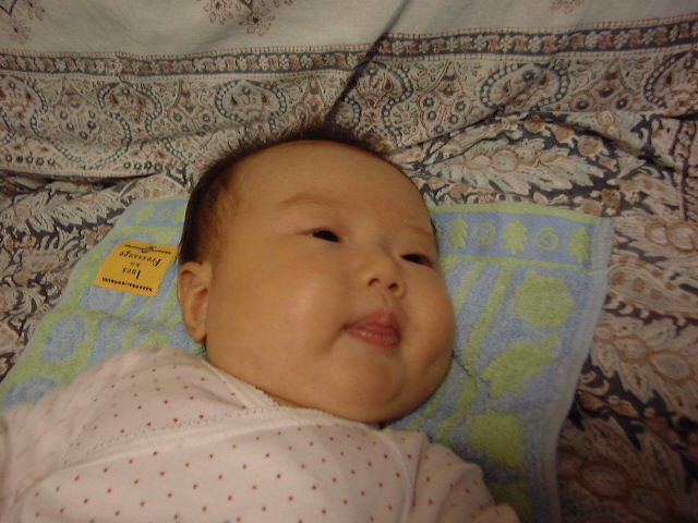 おしゃぶりしないかわりに最近、指を吸うようになった。時には握りこぶし丸ごとちゅぱちゅぱしゃぶっている。育児書の成長のめやすに、3か月に近くなると指をしゃぶるようになる、とあるが別におなかがすいているわけではなく、単に楽しいから吸うそうだ。しかし、日南子はほんとーに育児書とおりに大きくなっている。普通に育っているということなのだろう。育児書によると、もうすぐあやすと声をたてて笑うようになるそうだ。楽しみだ。