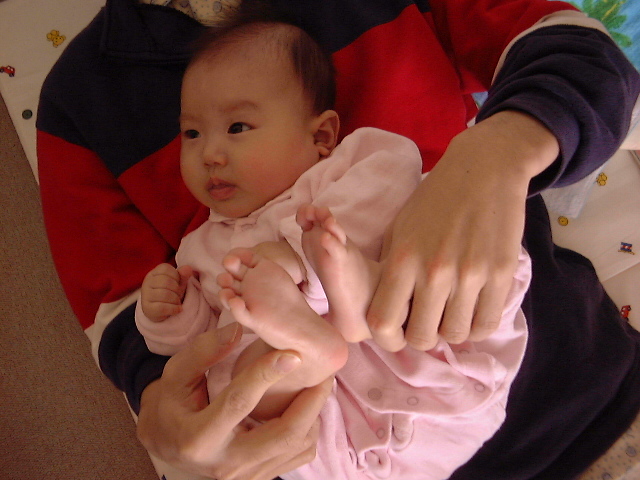 両足をつかんで動かしてやると機嫌がよくなることを最近発見。むーすんで、ひーらーいてーの歌にあわせて脚を開いたり閉じたりしてやる。何が楽しいのか大笑い。日南子の足の裏はぷにぷにしててさわりごこちがいい。