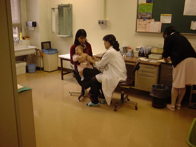 まずお医者さんに聴診器で診察してもらう。喉が赤くなってないかもチェック。次に、お医者さんから注射液のラベルを見せられ、3種混合であることを確認させられる。いよいよ注射。意外と針が太くてぎょっとする。ささって2秒後くらいに日南子、「ぎゃー」。予想どおり泣きました。やっぱ痛いよねえ。注射は、、、、。しかし、2、3分後には泣き止んでケロっとしている。よかった。