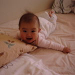 今朝は起きた直後にうつぶせになって少し遊んでた。体調がよくなったのかもしれない。その際に、ほんの少しではあるが、ずって移動していた。ホフク前進である。近くにあった起き上がりこぼしをさわりたかったようである。これってハイハイの前段階なんだよね。早く自分で行きたい所に行ければいいねえ(しかしそうなったら目が離せないか)。
