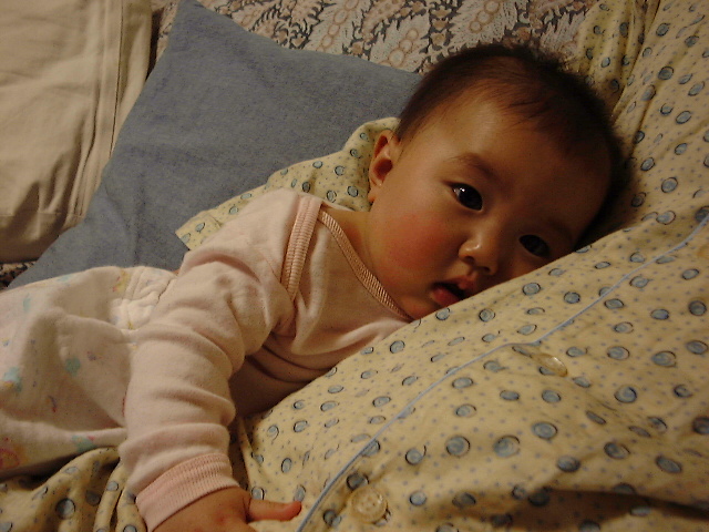 途中、無理矢理昼寝させようと由香のベッドに入れたら、一瞬機嫌がよくなりにこにこしだしたが、由香がちょっと見にきただけでまた「うえーーん」。合計2時間は泣いてました(笑)。