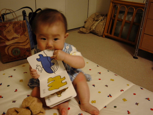 しかし、最近の日南子は夜は困ったちゃんだ。なかなか寝付かずころんころんと寝返っては、起き上がり、はいはいしてベッドの柵につかまって立とうとする。あげくのはてにはライトの紐をひっぱって遊んで、こわしてしまった。全くもー!睡眠中も夜泣きで大騒ぎ。寝ぼけて泣き出すこと数回。多分夢でも見てるんだろうけどさ、、、いったいどんな夢みてるんだろ。注射器でも追いかけてくるのか?