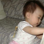 今回は日南子はすっかりなれちゃって、いろいろ探検していた。どんどんすみっこにいっちゃってテレビの陰に隠れてしまった。あと、ソファをのぼって乗り越えようとする。落ちたら痛いというのが分からないから大胆である。おっこちそうになるたびに、私とカー君のお母さんがあわてて日南子の足をつかんで止める。日南子はそのたびに逆さづり。余談だが赤ちゃんって逆さづりが大好きだ。日南子はよく真基さんに逆さにしてもらって大喜びしている。満面笑顔で「うわーきゃははは」と変な歓声をあげる。カー君もおかあさんに逆さにつられていて嬉しそうだった。しかし赤ちゃんって思いもよらぬ行動をとるもんだ。私もカー君のお母さんも笑いっぱなしであった。