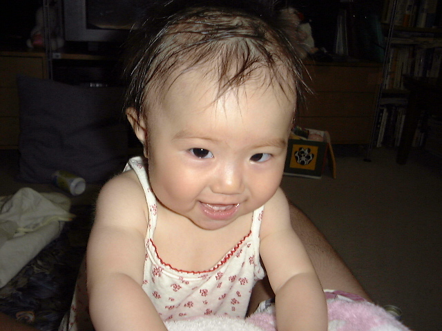 今日は朝から蒸し暑い。寝ている日南子も汗だくだく。起きると髪がべったり貼り付いた状態。バーゲンで買ったキャミソールとショートパンツをはかせる。これなら風通しがよかろう。おなかもはだけられるし、、、。しかし暑いのに日南子はべたべた私にくっついてくる。赤ん坊の体温は高いので、まるでカイロがくっついてるみたいで、こっちも汗だくになってしまう。
