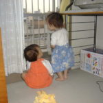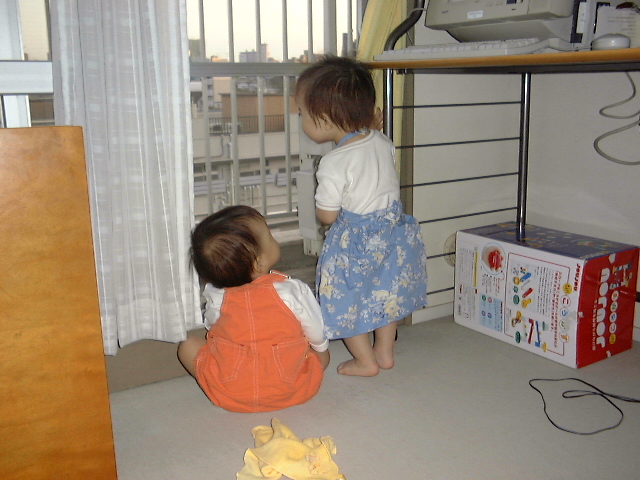 汐見ちゃんは昨日1歳になったそうだ。汐見ちゃんは我が家に入るなり、壁にかけてあったミッフィーのカレンダーに反応し、「あー!!」と指をさす。なんか日南子よりお利口さんだ。日南子は汐見ちゃんのママが好きなようで、笑顔で突進したり、そのへんのおもちゃを渡したりしていた。汐見ちゃんは人見知りすることもなく、マイペースで黙々と集中して遊んでいた。なんとなく日南子と汐見ちゃんは体形・髪のかんじ・顔のかんじが似ていて笑えた。2人で並んで窓辺で外を見ている後ろ姿はそっくり。