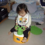 日南子は最近おまる(豊田のおばあちゃんに買ってもらったもの)にまたがり、「ちー、ちー」と言う。しかし言うだけで本当におしっこしているわけではない。あんぱんまんのかたかたにまたがって 言ったりするし。「いないいないばぁ」のトイレトレーニングシリーズを見て真似してるんだろう。一度、寝起きの日南子をおむつ取っておまるに座らせたら号泣された。寝起きですっきりしないのに、急に無理矢理座らされたからいやだったのだろう。