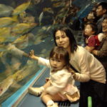 館内に入るといきなり大きな鯉がぐわーっとおよいでいる姿が目に入ってきた。日南子、喜ぶ。妙に人が少ないと思ったらちょうどイルカショーの真最中だったらしい。見にいったら立ち見席まで溢れていた。仕方ないので日南子は真基さんに肩車してもらい、すきまからイルカを見せる。やはり大ジャンプとかすると一応見るのだが、小さいアクション(ボールをつついたりするやつ)になると見ない。まあそんなもんかな。