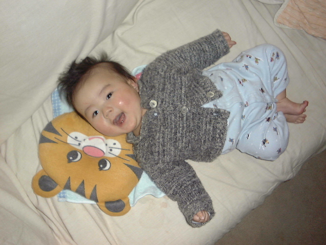 このごろ裕月もそれなりに自己主張するようになってきた。ほったらかしで寝かせておくと「うえっうえっ」と甘えた声でぐずる。で、近寄ると「うわーうれしー」って感じで満面笑み。