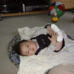 裕月はちょうど眠い時間で待合室のベビーベッドの上でも「うげーうげー」と機嫌が悪かった。日南子は上機嫌でベビーベッドに登って赤ちゃん用のおもちゃで楽しそうに遊んでいた(やはり自分とは無関係と思っているもよう)。 すいていたのですぐ順番がまわってきた。喉を見るためのヘラをつっこまれて裕月、むせる。いよいよ注射。針がささって2秒後に「うあーーーー」と悲鳴。でもすぐ泣き止んだ。けっこう強いぞ。注射の痛みより眠いことのほうがご不快なご様子。