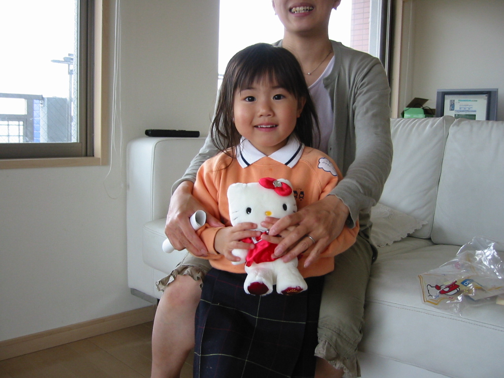 それらの説明が終わって、今度は園児たちと記念写真。こあら組がやってきて、日南子のそばに行くと途端に泣きべそ。仕方ないので日南子はパパに抱っこされて写真に写ることになる。 おまけに裕月が今度は眠くて大泣き。私が裕月を抱っこしたのだが、前列の見知らぬパパの頭を蹴ったり、隣のママさんの顔をパンチしたりもう大暴れ。写真を撮る間、ずっと裕月の絶叫がとどろきわたっていました・・・。恥ずかしい。この写真を見る勇気がありません。